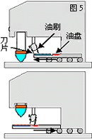油墨在這機款中是放置于倒轉的密封式油盅里(圖4)。油盅緊貼于鋼板表面,令油墨不會漏出。同時間,油盅也有刀片的作用,在鋼板上來回移動,把油墨留在蝕刻圖案上。這裝置的好處是溶劑的揮發度可以降至最低。但要留意的是,油盅的價錢是可以很貴的,所以需要小心地使用。油盅的類型越來越多變,無論在尺寸及設計方面,均能切合使用者之需要。