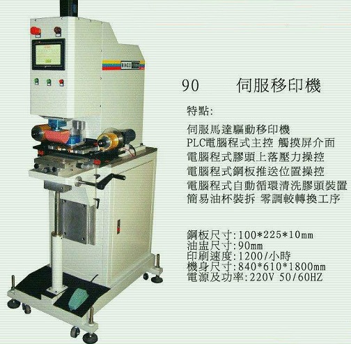 移印機主要由移印鋼板印版裝置(含供墨裝置)、移印機刮墨刀、移印膠頭和印刷臺等組成,