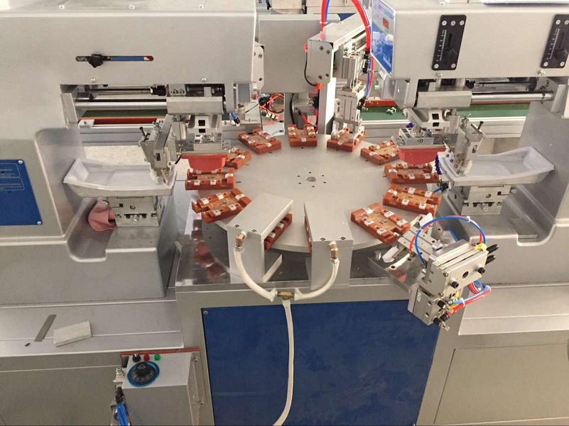 1、 印刷速度比轉(zhuǎn)盤機(jī)慢,但印刷工件可以大一些,兩個顏色一次套色印刷完成。