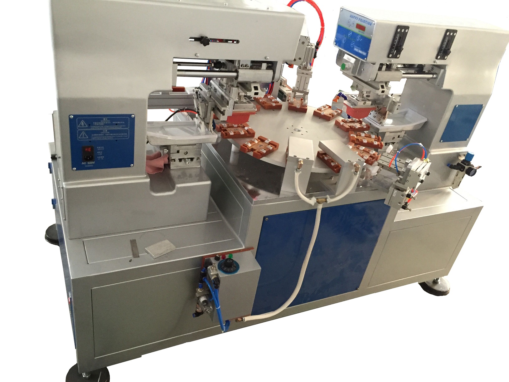 1、 印刷速度比轉盤機慢,但印刷工件可以大一些,四個顏色一次套色印刷完成。